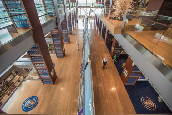On the first floor of the library, visitors can view the presidential limousine (and also buy miniature models of it, although a larger gift shop is located a five-minute walk into the downtown, part of the effort to revitalize the area). On the second floor, after watching a short video starring Clinton, visitors can sit in a recreation of the Cabinet Room and then wander among “alcove exhibits” on topics like the economy and foreign affairs. On the third floor, a roped-off replica of the Oval Office awaits, along with artifacts from state dinners, gifts given to the president (including Michael Jordan’s present of … a statue of Michael Jordan), and gallery space for special exhibitions like one on presidential pets.