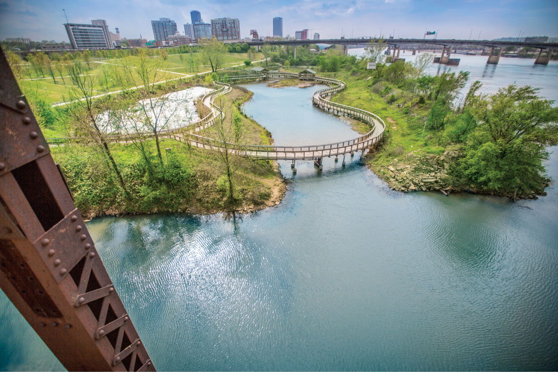 On one side of the roof, a practice putting green is surrounded by blueberries and yellow roses, the favorite flower of Clinton’s mother. On the other, a boardwalk winds through a garden of regional plants, as well as wind chimes and a solar-powered pipe organ. The roof is only four stories up, but in Little Rock, that’s high enough to provide a fairly spectacular view—of the grounds and river below, and of the small-city skyline just across the interstate.