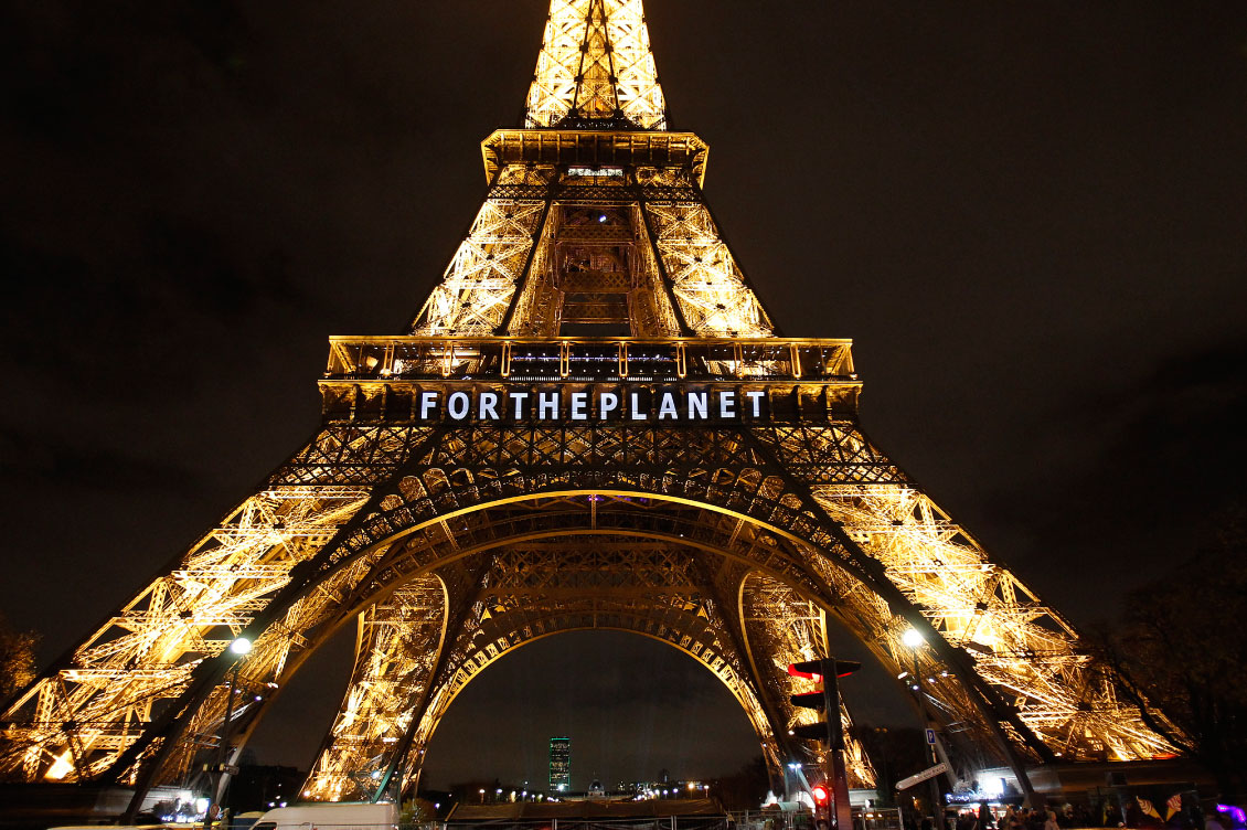 Opening: The Eiffel Tower displays messages as part of the 21st Session Conference on climate change in Paris. Photo: Thierry Chesnot/Getty Images