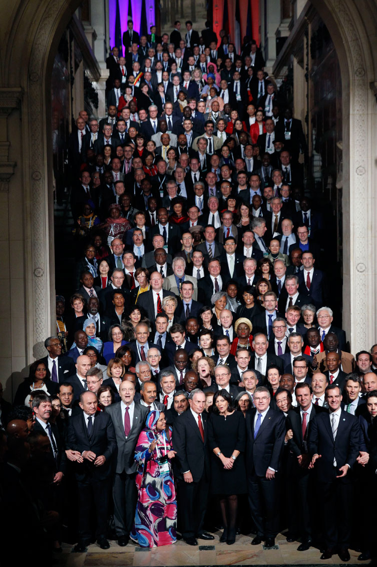 Former Mayor of New York City, Michael Bloomberg, and Mayor of Paris, Anne Hidalgo, pose with leaders from different cities at the Paris city hall during the COP21 Paris Climate Conference. Photo: Thierry Chesnot