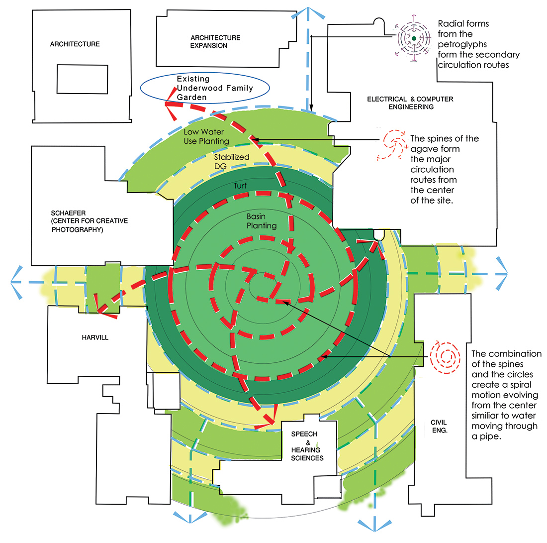 Stoltz and students from the master of landscape architecture program, Micaela Machado and Rayka Robrecht, redesigned an existing 70,000-square-foot parking lot (equivalent to the size of one-and-a-half football fields) into a community gathering place—which includes underground cisterns that collect condensate water from nearby buildings and retention basins. The green space design will be the second largest on campus. Parking spaces lost will be replaced with parking garages located throughout the campus. The design’s intention was to educate the public about the use of rainwater and water conservation—for example, water collected by the cisterns for irrigation would reduce normal annual irrigation needs by 87 percent (610,000 gallons saved).