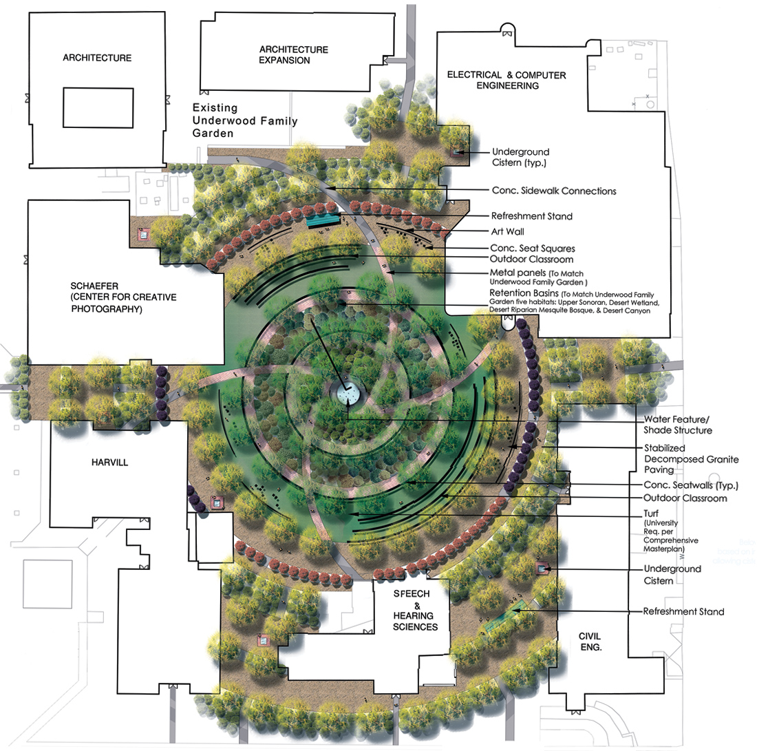The University of Arizona has a recent history of designing landscapes that conserve water resources, such as the Sonoran Landscape Laboratory that uses 83 percent less potable water than similar Tucson landscapes.