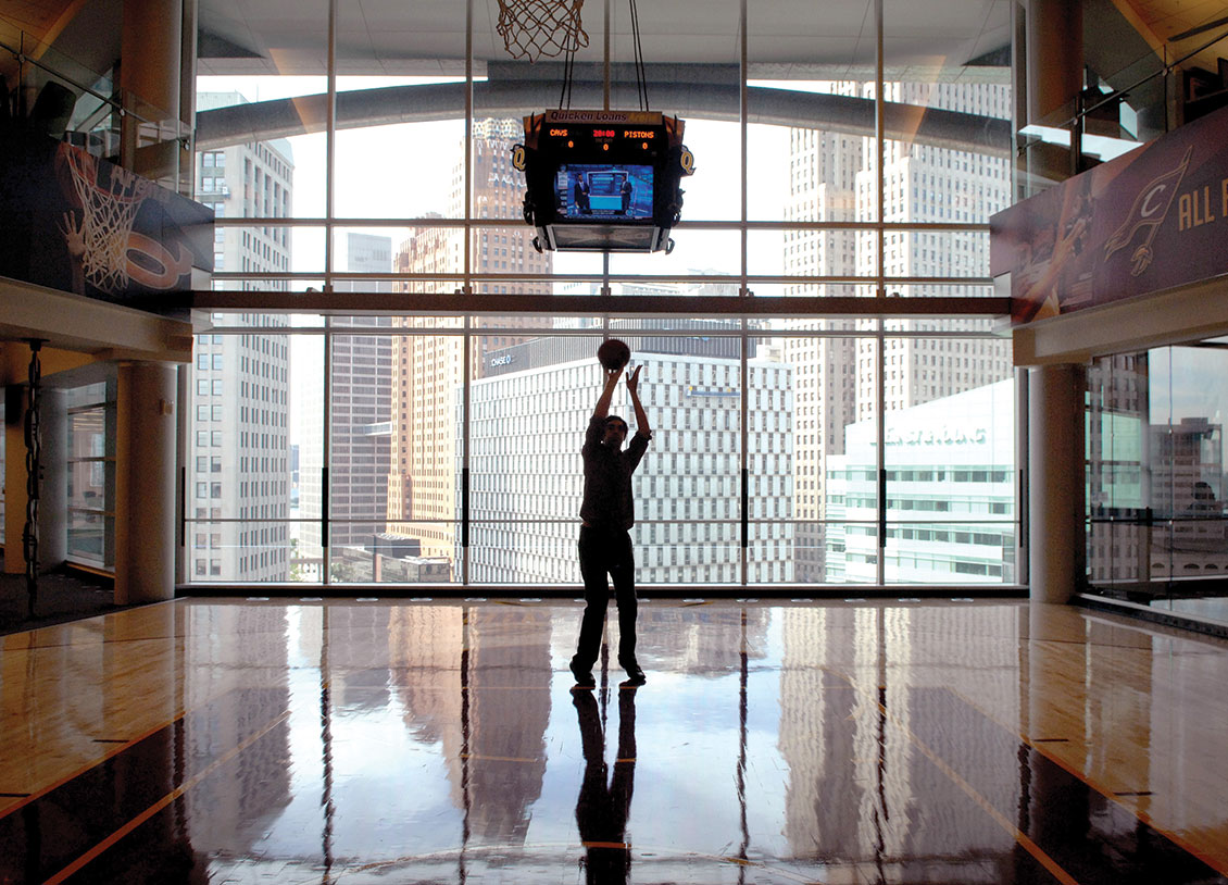 Schwartz gazes down at Campus Martius from a social media command center set up in a room designed to look like half of the NBA’s Cleveland Cavaliers home court. And, although hip and unique office spaces are practically mandatory for Gilbert’s companies, this is more than just a whimsical touch: Gilbert owns the Cavaliers. (Nationally, he’s probably best known for the scathing missive he posted online hours after superstar LeBron James announced he was leaving the Cavaliers for the Miami Heat. In the note, Gilbert called James “heartless,” “selfish,” and “disloyal” and made a less-than-prophetic all-caps guarantee that the Cavs would win a title before James did.)