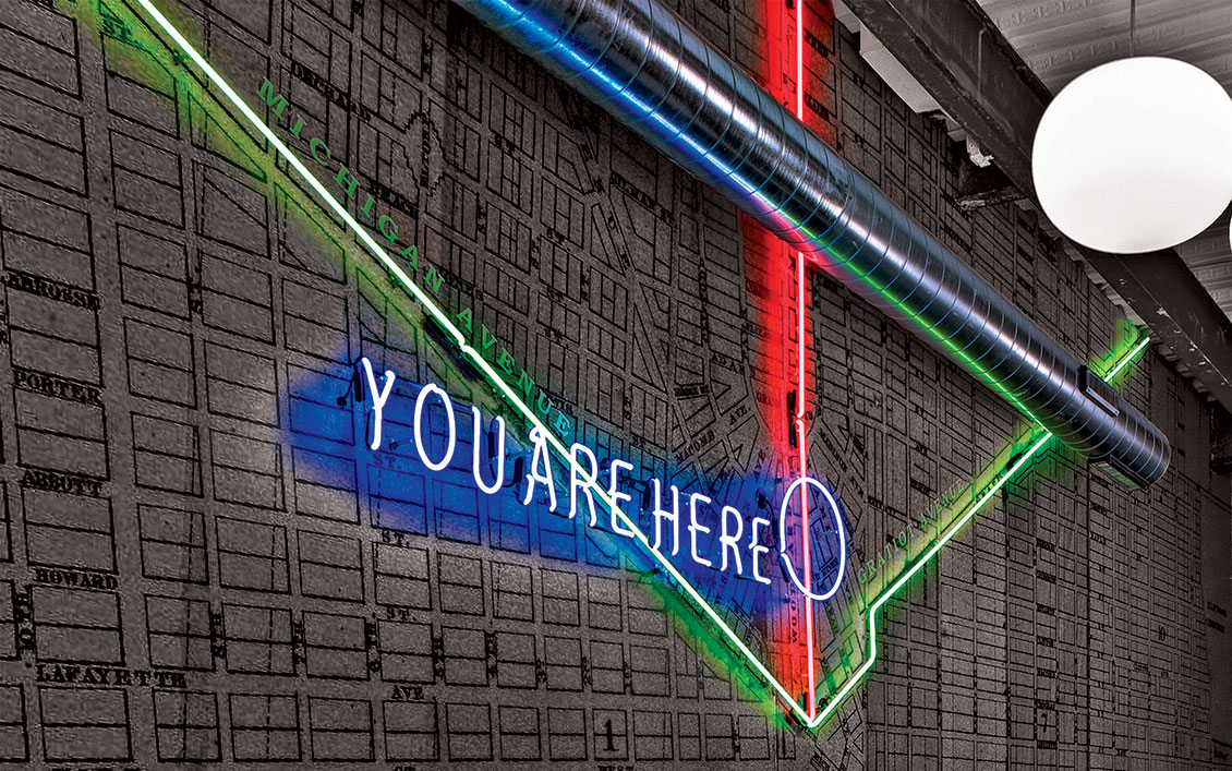 On the tour, Schwartz shows off Chase Tower, once a “brown bank building” with drab carpeting and fixtures. The interior is now open, airy, and filled with pops of color. One floor is filled with a sea of loan officers chatting busily into their headsets, their desks adorned with cardboard cutouts of their faces (the wall decal and graphics company Fathead is another of Gilbert’s properties).