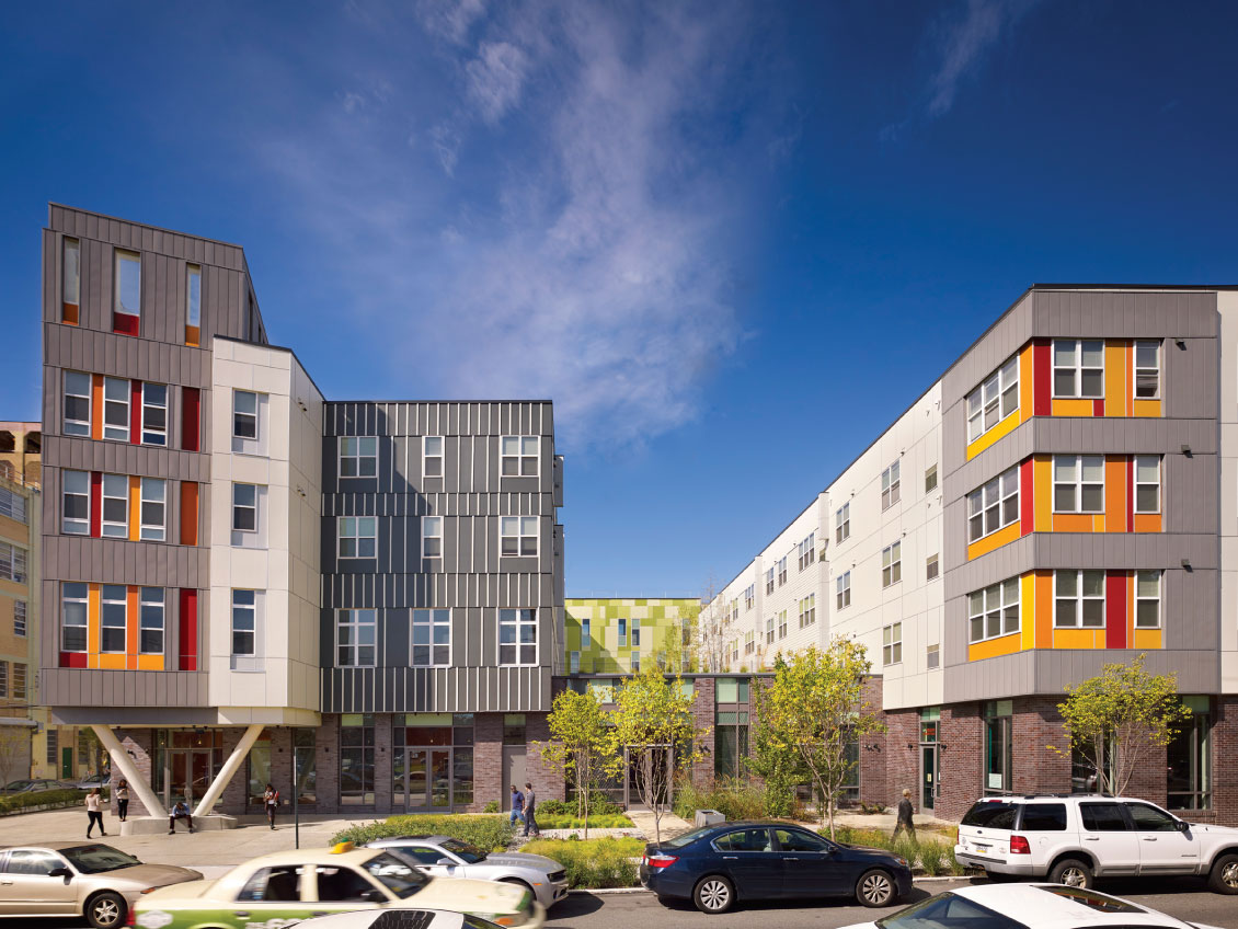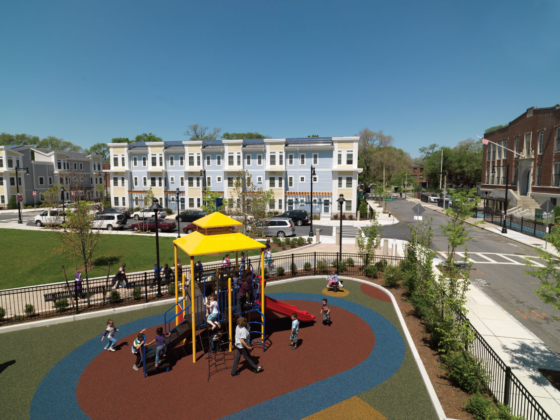 In 2009, once demolition crews erased Old Colony’s past incarnation, developers Beacon Communities, in partnership with the Boston Housing Authority, aimed to redevelop the entire context of the site. With a blank canvas, Prakash says, LEED ND criteria helped craft a holistic vision for the siting and connectivity of the neighborhood. But when New Ecology discovered the Affordable Green Neighborhoods Grant Program and joined its first round of recipients, those LEED ND criteria became more than sources of inspiration. “If there were moments when it would have been easier to do something a different way, there was an understanding that those principles were now set in stone,” Prakash says.