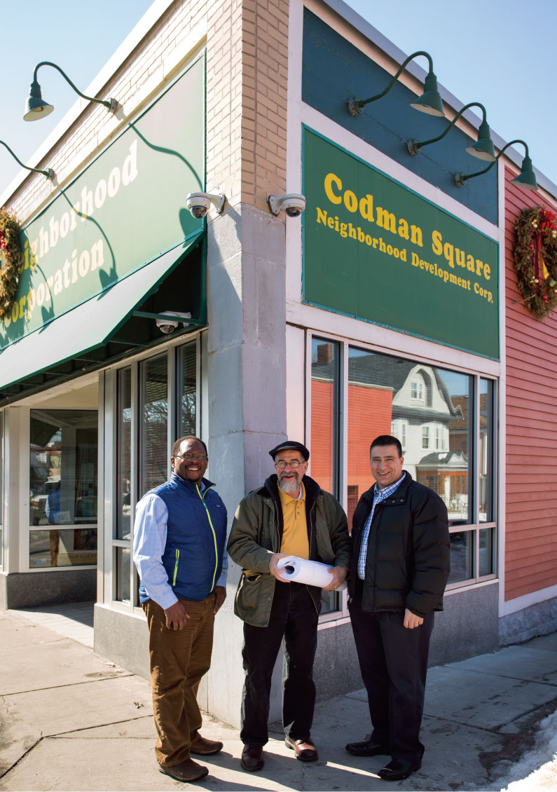 Dave Queeley, Mark Dinaburg, and Jirair Ostayan outside Codman Square Neighborhood Development Corp. Photo: Eric Roth