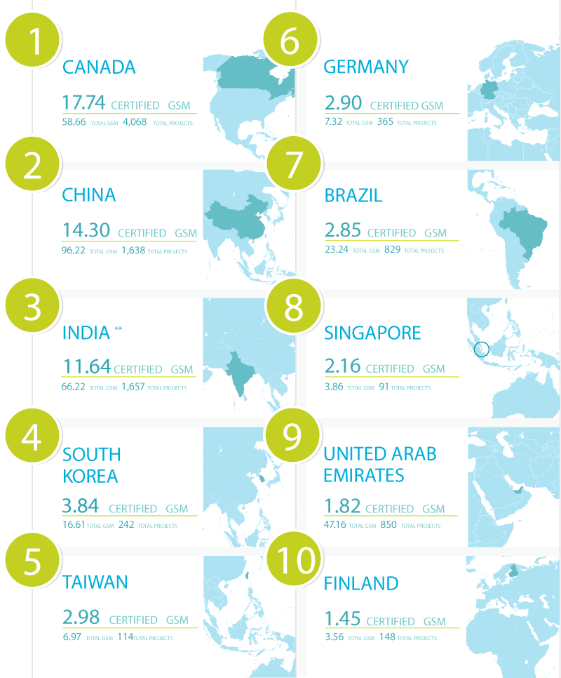 As it continues to scale internationally, USGBC is continually developing resources and building out support to ensure that LEED can be applied in any geographic area, and also keeping tabs on areas of growth. Take a look at which countries outside of the United States have the largest LEED presence, ranked by millions of gross square meters (GSM) of LEED-certified project space.